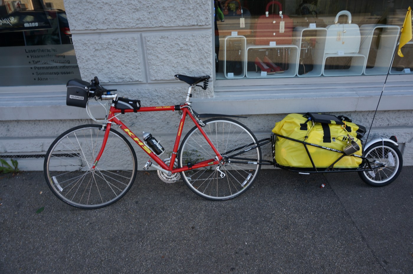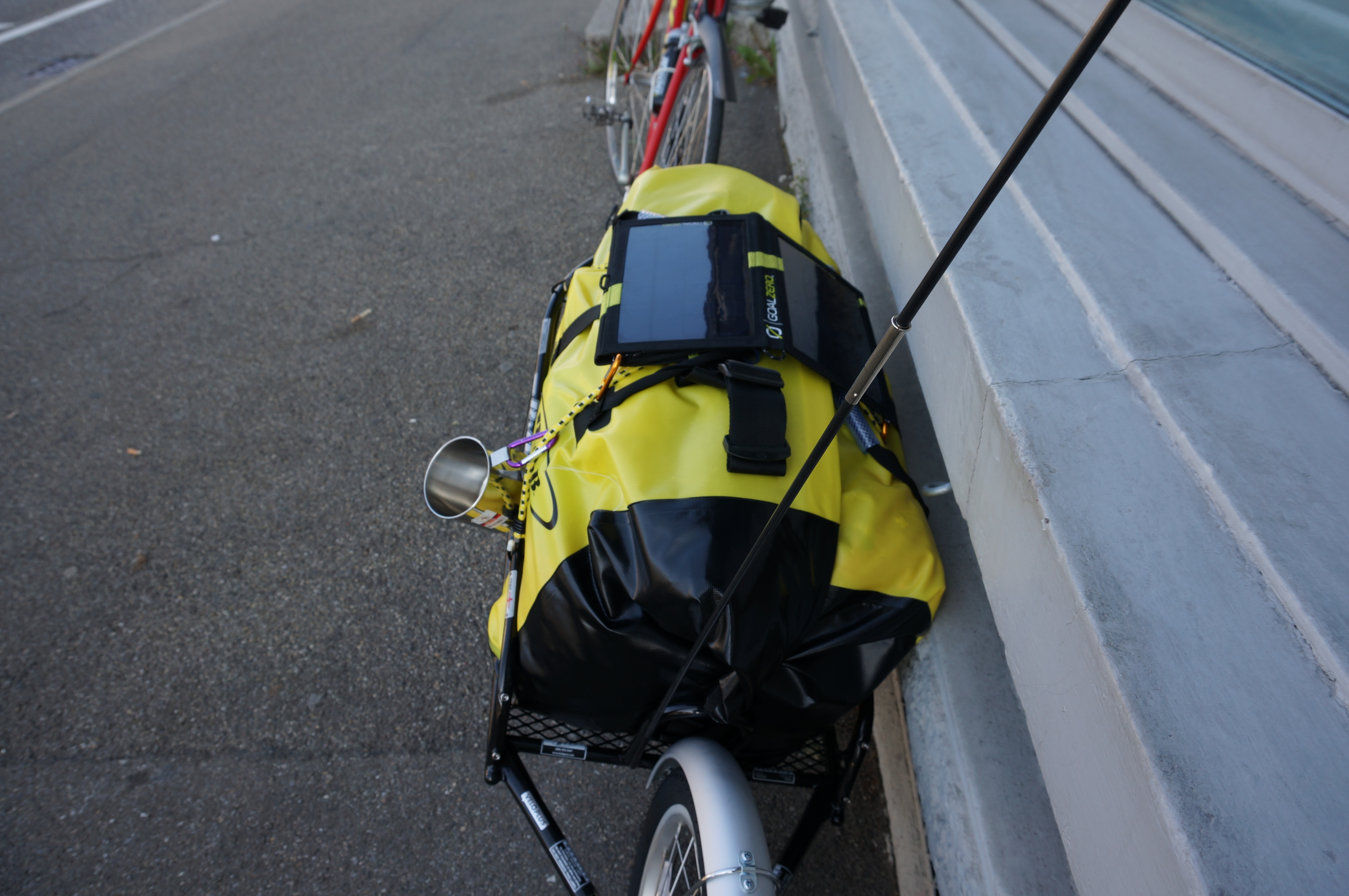 La bicicletta che ho usato é sempre la stessa easton KHS del ’97 da corsa, modificata. Per il trasporto dell’attrezzatura, mi sono affidato al mulo americano. O meglio, un rimorchio monoruota, BOB Yak, che permette di portare fino a ca. 30Kg. A parte la panne, in cui mi si é rotto un raggio, da un cambio di marcia non troppo appropriato, i mezzi si sono dimostrati affidabili. La guida diventa differente trainandosi 30kg, pero’ poi acquistando confidenza e sicurezza, si viaggia bene, con buon ritmo e buona velocità.