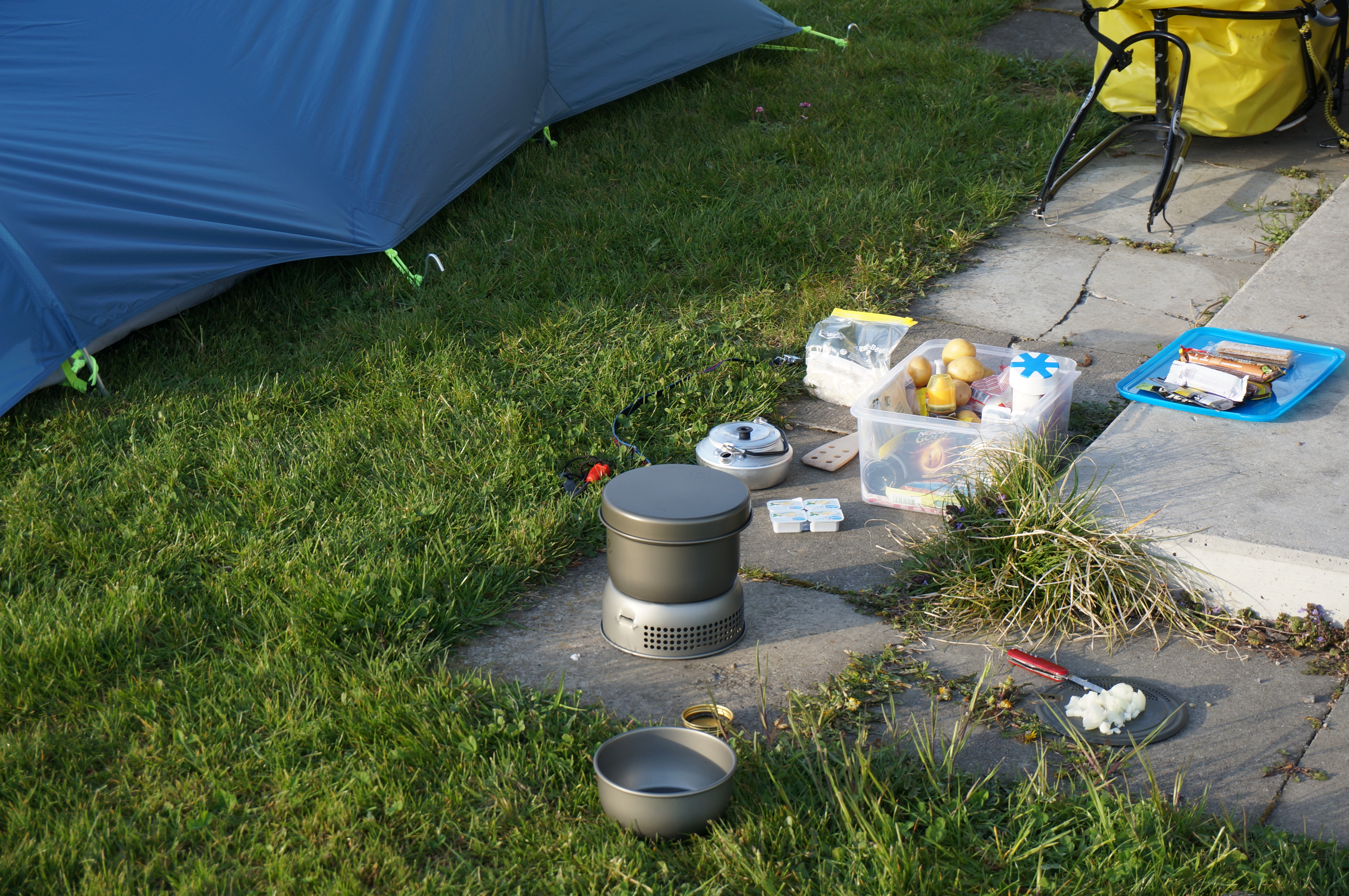 Il mese scorso ho avuto la fortuna di poter andare a una borsa per attrezzatura da campeggio, in cui ho comprato diversi articoli di buona qualità a prezzo molto scontato. Ho trovato un buon sacco a pelo North Face, stuoia e cuscino Therma-Rest, pannello solare NomadZero, e due pantaloncini da ciclista IceBreaker. La tenda Jack-Wolfskin da bivacco é stata acquistata direttamente allo store in città. Altro materiale, come la cucina da campo Trangia, purificatore d’acqua, pile ricaricabili, sacche comprimibili, e altro materiale é stato comprato in diversi shop, e store online.