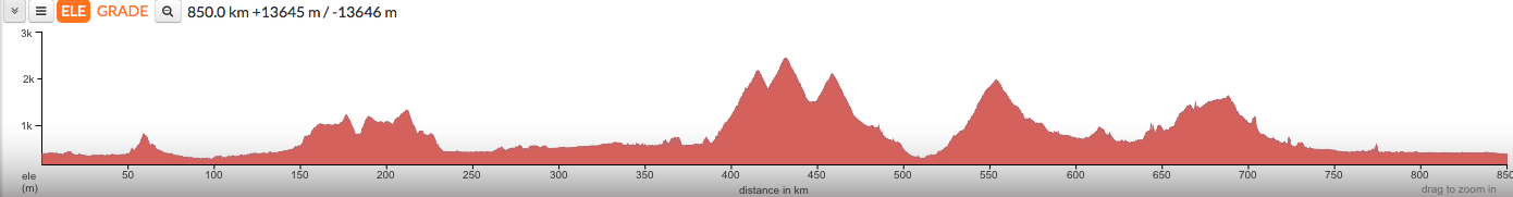 Il percorso totale é di circa 850 km, con dislivello complessivo di circa 13000 m, altitudine massima di 2427 metri in cima al Furka.