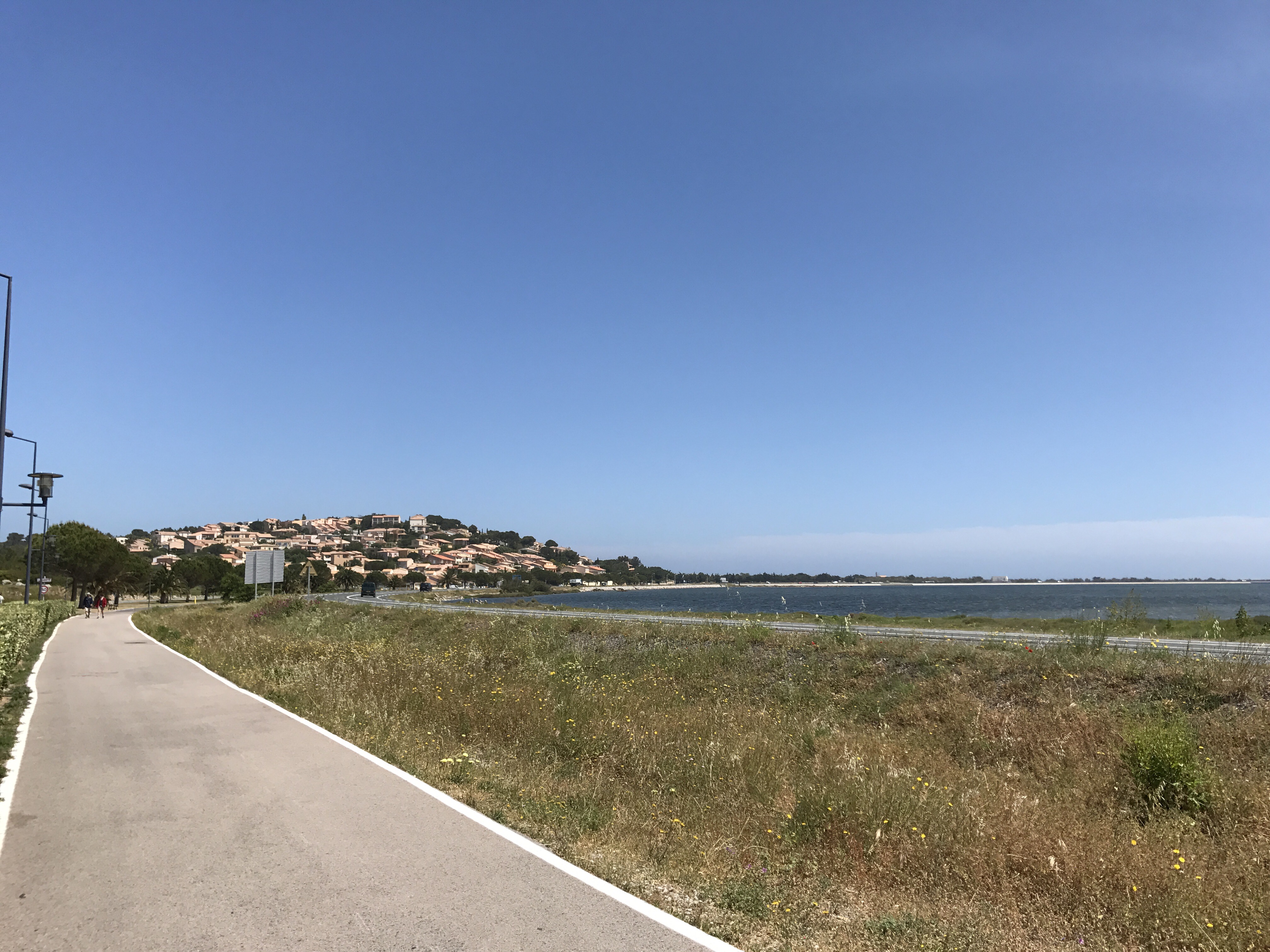 Dopo aver passato un’ottima notte, finalmente senza acqua ne vento, sono ripartito di buon’ora verso Narbonne. La tappa di 122 km è stata meravigliosa, molto sole, e arrivo al mare. Lunghissima ciclabile, accanto alla bella e immensa spiaggia, tra parchi naturali. Ho perso un po’ di tempo ad ammirare il bel paesaggio, e per evitare di arrivare a Narbonne con il camping già chiuso, ho deciso di bivaccare spontaneamente in un bel posticino, lungo la strada, acconto al fiume.