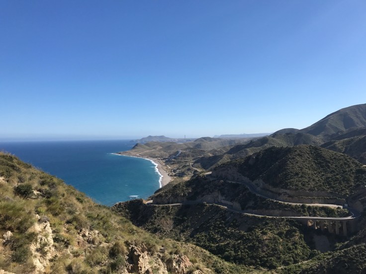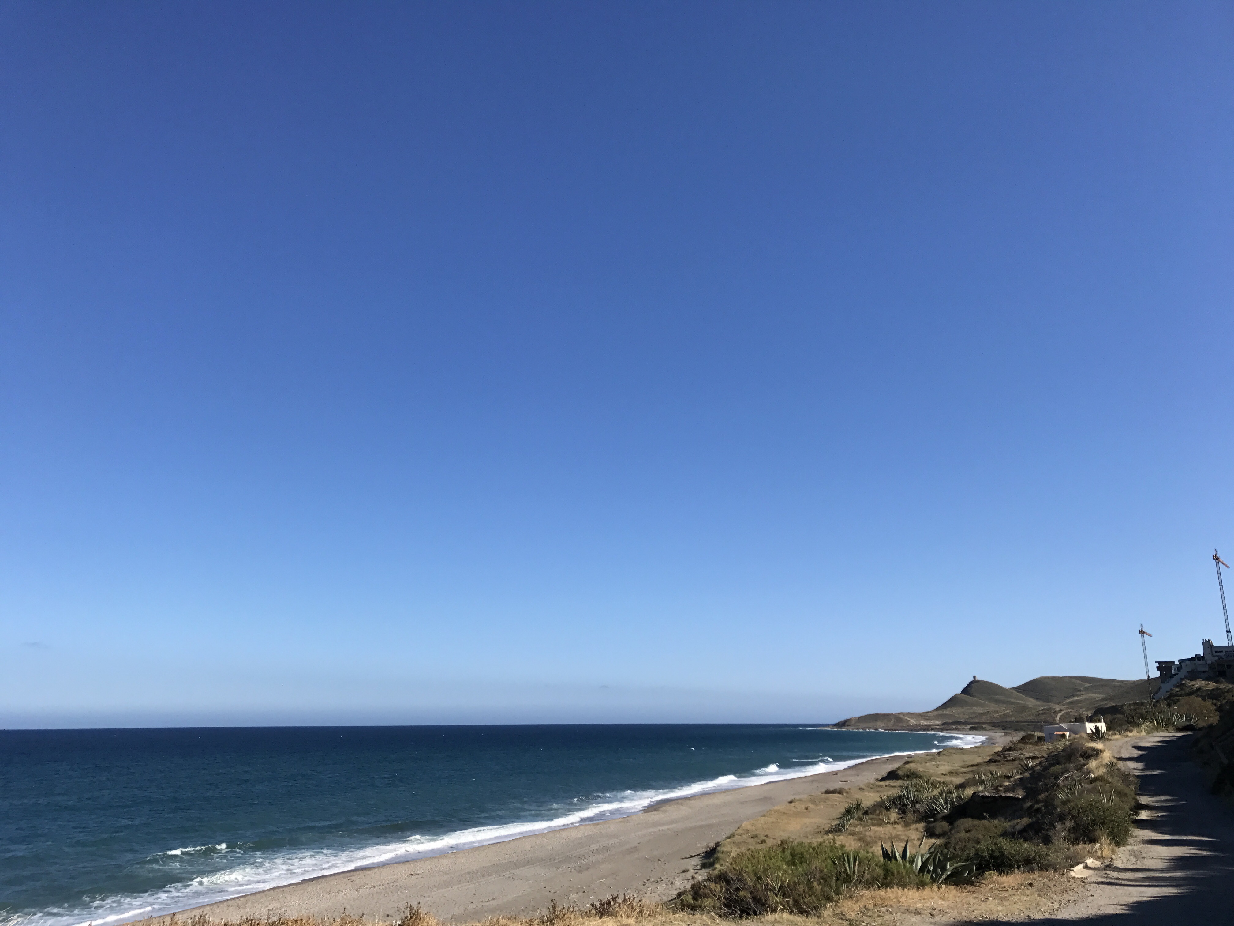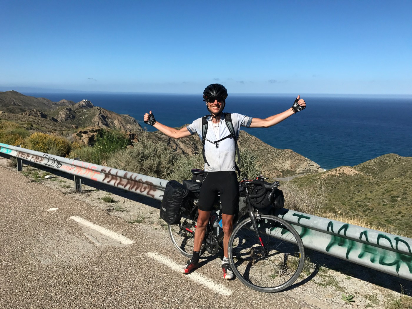 Con grande motivazione e energia sono ripartito alla buon ora. Ho pedalato per la mia prima volta 200km con un buon dislivello di 1300 m. È stata parecchio dura, ma un forte vento mi ha aiutato parecchio. Poi strade buone e il bel paesaggio hanno fatto il resto per motivarmi. Il tratto nella riserva naturale di Cabo de Gata mi ha molto impressionato, davvero stupendo. All’arrivo poi ho festeggiato alla pizzeria del mio amico David, dove un ottima pizza di Mauro mi ha sfamato. Passerò qui un paio di giorni di relax, prima di ripartire verso Malaga.