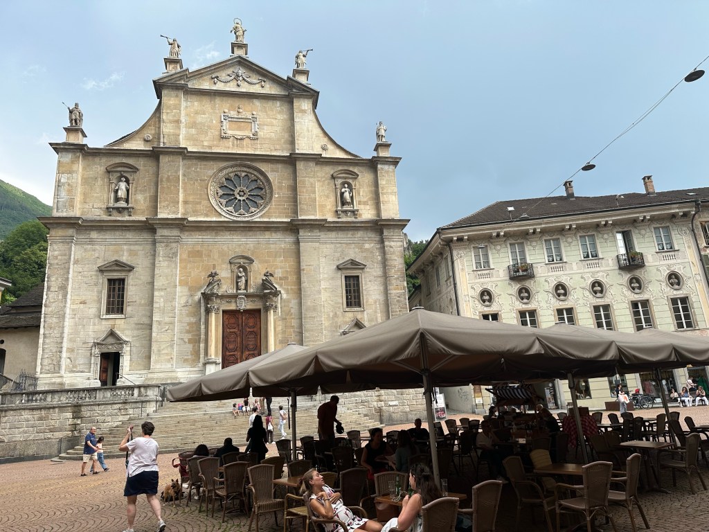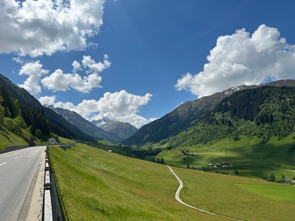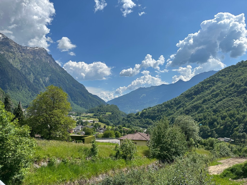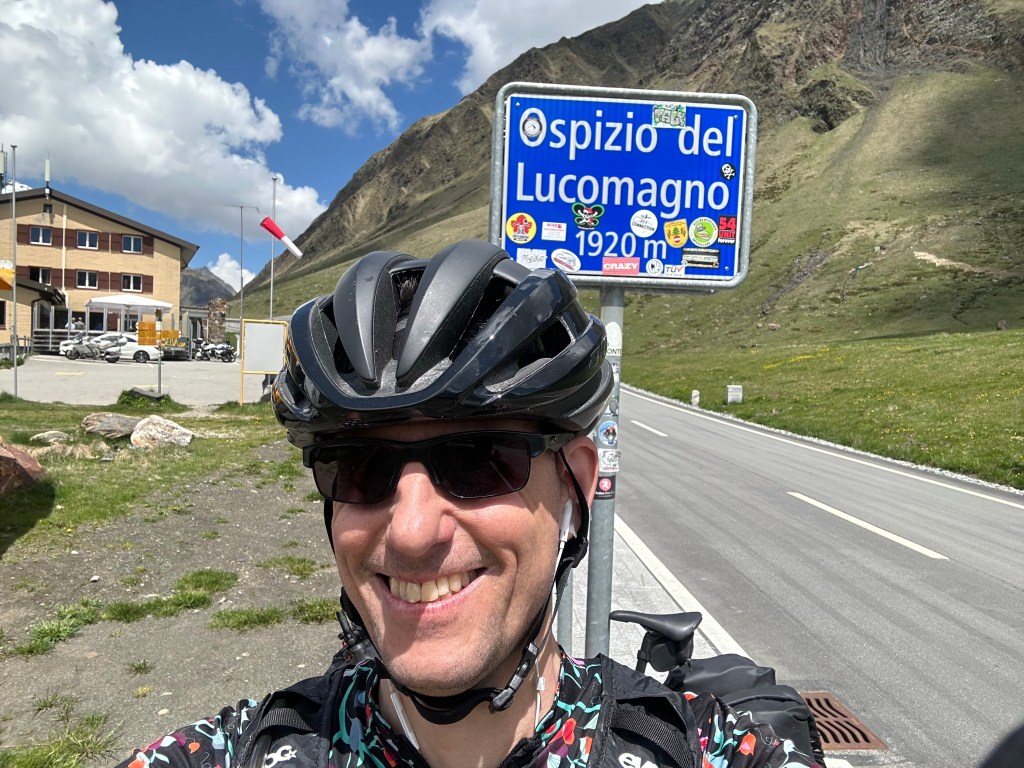 Dopo un buon riposo, parto e scendo a Ilanz per fare una piccola colazione. Da qui proseguo per tutta la Surselva. La strada è bella, pedalo spensierato gustandomi il bel paesaggio montano. Arrivo a Disentis e mi fermo per fotografare la sua bianca e imponente abbazia. Da qui prendo per il mio primo passo del viaggio, il Lucomagno. Una bella salita non troppo impegnativa, ma che comunque, visto la mia zavorra, mi fa penare abbastanza. Arrivo in cima al passo quasi sfinito, ma poi con un buon pranzo e tutta la soddisfazione, riprendo nuovamente energie. Dopo un piccolo volo col drone e foto di rito al cartello del passo riprendo la mia strada. La lunga discesa percorre tutta la valle di Blenio. Trovo che la prima parte fino a Olivone sia la più interessante, zona montana e biotopo naturale protetto. Finita la valle arrivo a Bianca e continuo per la Leventina fino a Bellinzona. Non amo particolarmente questo tratto, vento contrario e molto traffico. Ho penato quasi di più qui che sul passo. A Bellinzona mi fermo e approfitto per far visita a un vecchio amico commilitone di scuola recluta. Incontro il Gabu al suo bar Incontro, anche qui discutiamo del nostre vite e esperienze. Intanto il cielo si fa scuro, riparto con una leggera pioggia che mi accompagna fino a Locarno. Prendo alloggio da mio fratello Marc. La sera usciamo insieme e incontriamo altri amici, Carlo e Andy, per aperitivo e cena. Il tema della serata é la rifondazione del nostro vecchio gruppo musicale, Dreifuss. Le idee, sopratutto quelle di Carlo sono molto osé e pertinenti, ci facciamo del gran risate. Torno a casa e mi corico per la notte un po’ brillo e ancora divertito.