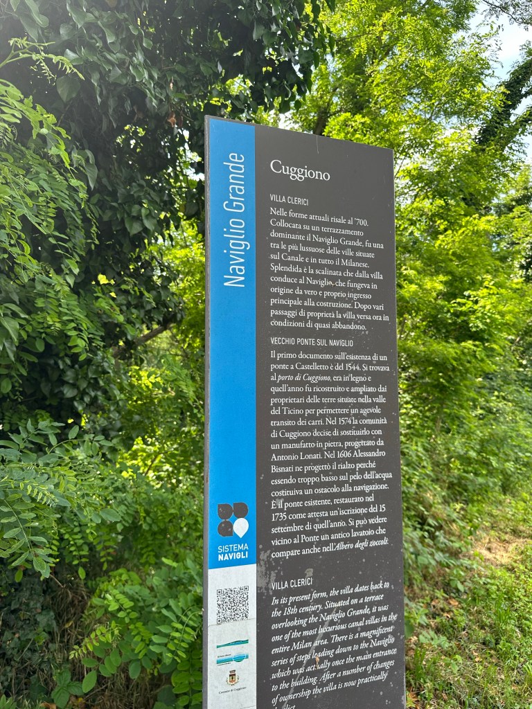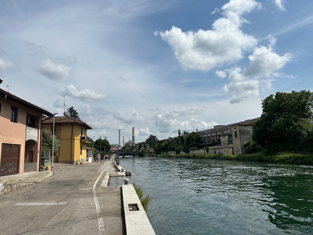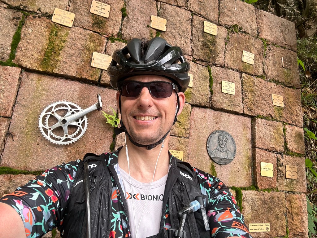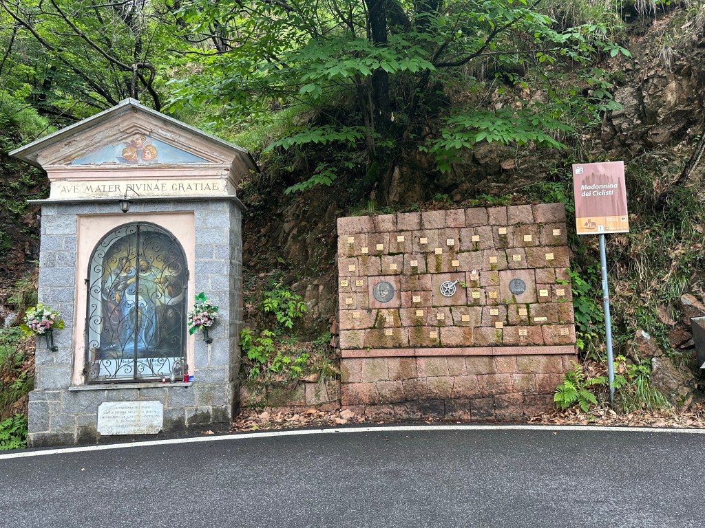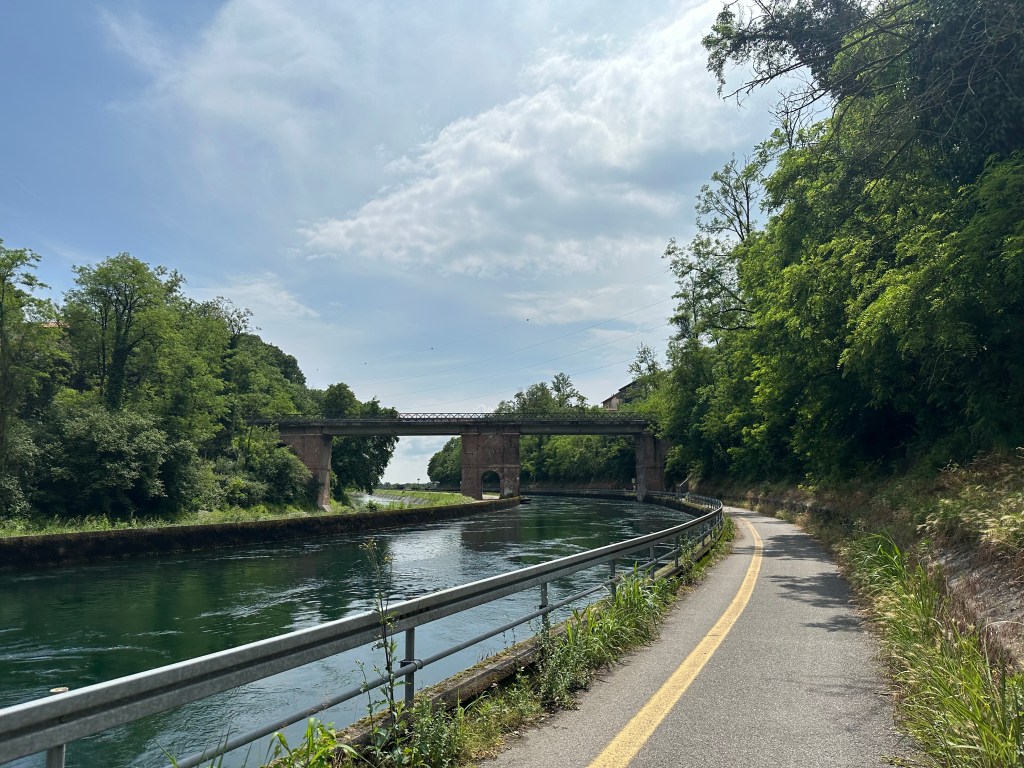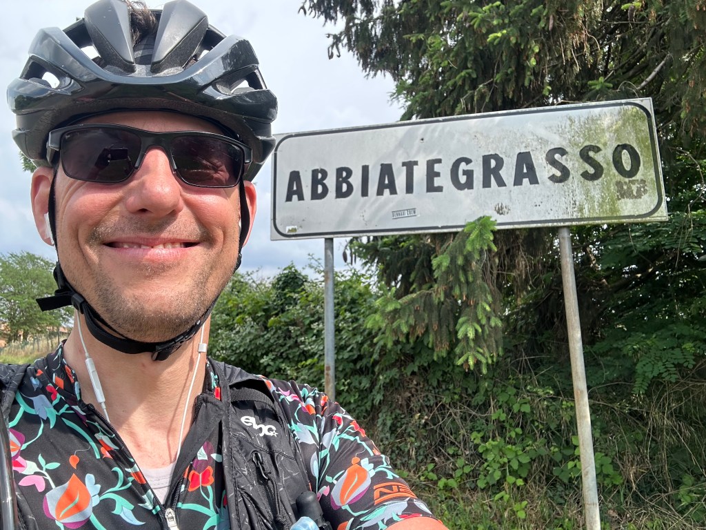 Parto verso le otto e mezza con una leggera pioggerella e pedalo sulla strada che costeggia il lago maggiore nel Gambarogno. A Dirinella passo il confine svizzero e arrivo in Italia. Continuo il percorso sul lago fino a Luino. Al primo bar, sosto per un primo cappuccino italiano. Lascio il lago e prendo per Varese, non molto interessante a parte la salita con il tributo ai ciclisti. Faccio alcuni scatti e riprendo la strada, ritrovandomi con sorpresa sulla bella ciclopista del parco del Ticino e poi del naviglio grande. Intanto il tempo si é fatto bello. Mi godo il sole, pedalando serenamente, il percorso é praticamente piatto. Finisco la tappa verso le sedici e trenta ad Abbiategrasso. Mi sistemo in un accogliente B&B, faccio una doccia ed esco per una pizza. Non vado a dormire troppo tardi, visto che mi spetta una lunga tappa.